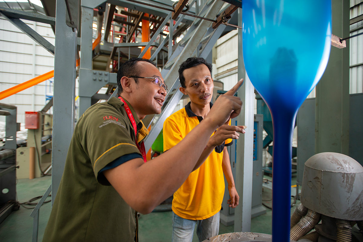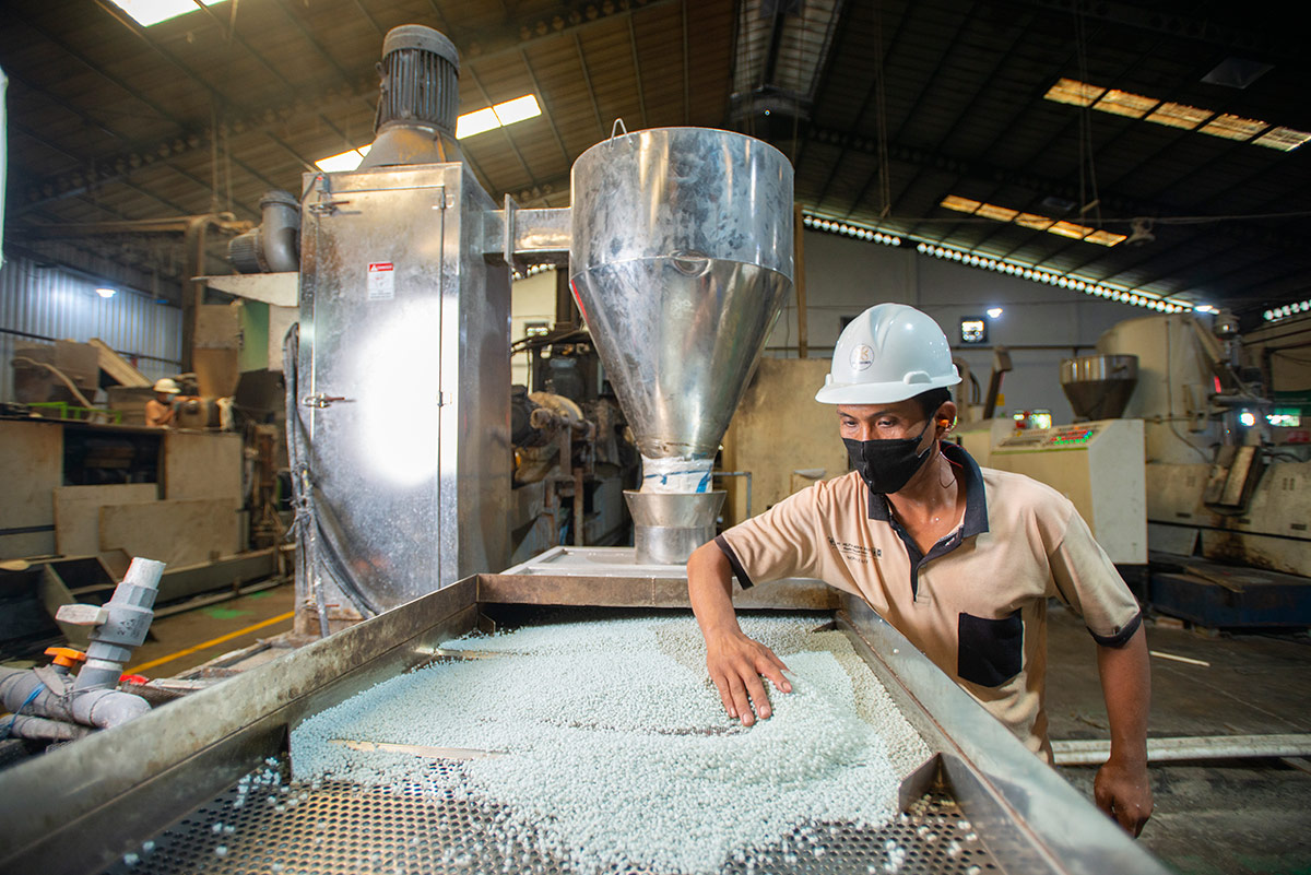 Recycling process in PT. Pelita Mekar Semesta starts from collecting process which done with strict quality control process to sort various types of raw materials that will go to the crush and clean facility before ended up in the palletizing process. With modern machineries, experienced personnels and high standard of operation, we produce the best plastic pellet products and also the blown film plastic products.